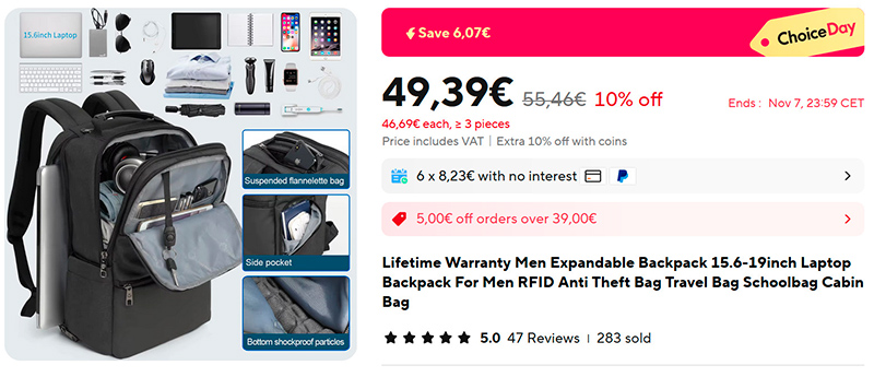 Вместительный рюкзак с расширяемым объемом от Tigernu (ссылка для РФ). Защита от воров, влагозащитный материал Oxford, встроенный USB-порт для зарядки.
