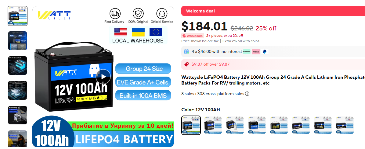 Литий-айрон-фостат аккум на 100 ампер-часов и 1.2кВ-час. Обратите внимание на цену. Чувак на ютубе протестировал и разобрал, вроде, фашисты не обманывают. Cенсоры на температуру и ток срабатывают, ёмкость как заявлена, качество внутри норм и т д. Фиг знает, может, только за первую покупку такая цена, потом удваивается. Видел такое на Алишке. Или, может, сдохнет через 10 циклов (это чувак не проверял). Думаю купить, 3а такие-то деньги не жалко попробоватЬ.