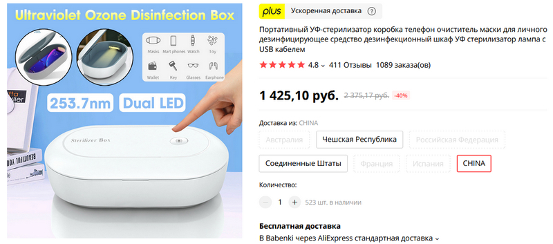 Вынужденно модная нынче тема - компактный домашний стерилизатор, проводящий дезинфекцию. Есть специальные смартфонные, но я считаю, что лучше взять более универсальную модель. Рассматривал разные варианты, больше всего понравился вот этот. Утверждается, что дезинфекция проводится и ультрафиолетом, и озоном. Для смартфонов, масок, всяких других мелких устройств и электроники. Но имейте в виду, что процесс этот - небыстрый. Ускоренный режим - 10 минут обработки, полный режим - 30 минут.