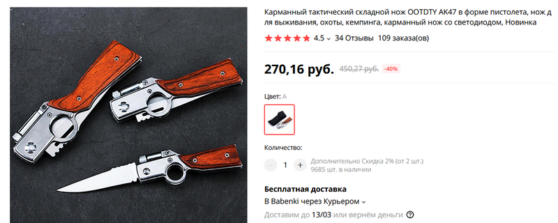 Прикольный пружинный складной нож в виде пистолета. В "курок" также встроен фонарик. Материал - нержавеющая сталь с твердостью 56HRC, рукоятка отделана настоящим деревом. Как он при этом стоит две копейки - непонятно совершенно, но я после китайских вполне нормально работающих часов за 1 евро уже ничему не удивляюсь. Я заказал, приедет - покажу.