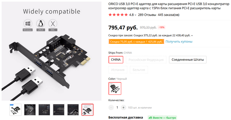 Если вам не хватает портов USB 3.0 в ПК, а соответствующие хабы по каким-то причинам использовать неудобно, то вот вариант встроенных портов от Orico под слот PCI-E.