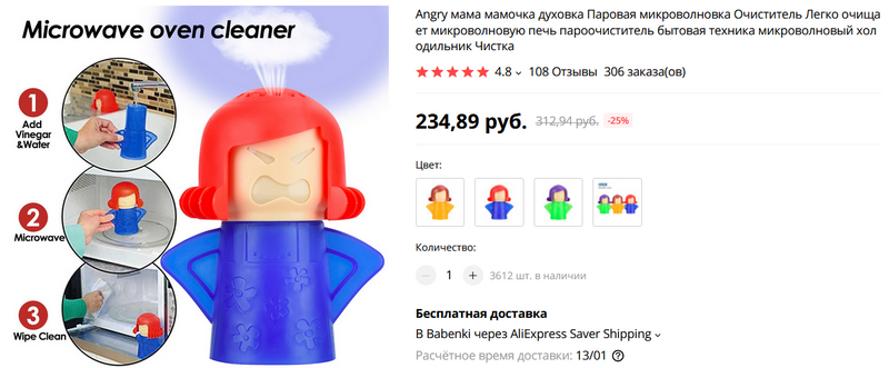 Эту штуку друзья посоветовали. Сказали, что при всей простоте конструкции действительно эффективно чистит микроволновку. Как это работает - видно на картинке: в фигурку заливается вода с уксусом, ставится в микроволновку, включается на несколько минут на полную мощность, пар очищает устройство изнутри, после чего остается только протереть микроволновку бумажным полотенцем. Ну и название "Сердитая мама" - тоже хорошо придумано.