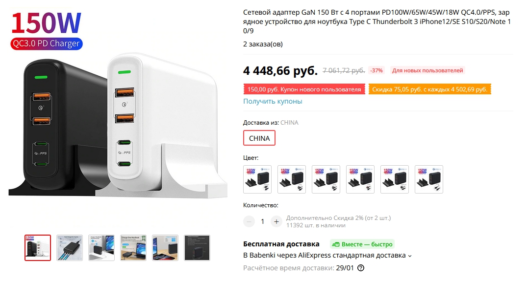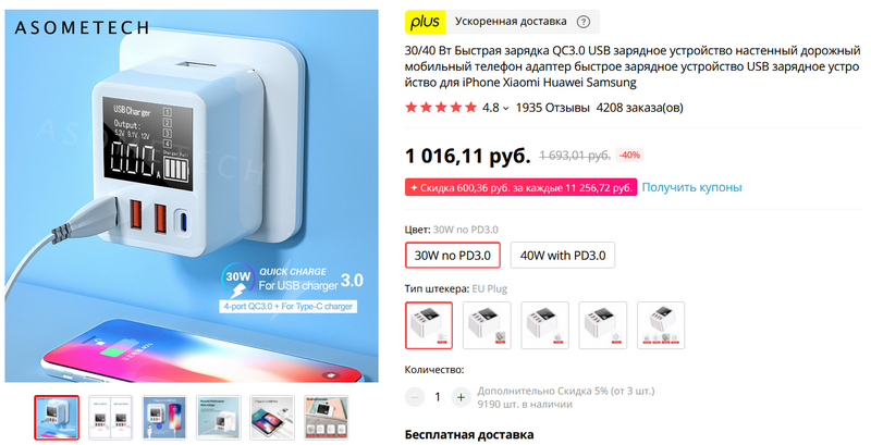 Интересная штука - четырехпортовый зарядный адаптер под розетку с поддержкой QC 3.0 и PD 3.0 мощностью в 30 и 40 ватт. Можно выбрать тип переходника с китайской вилки.