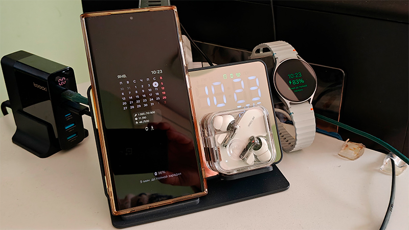 Еще раз замечу, что зарядка для часов - только для Samsung, а зарядка для смартфона и наушников - для любых устройств с поддержкой Qi. И я бы эту зарядку купил даже только для смартфона и наушников - очень удобно. Раньше я смартфон заряжал на горизонтальной беспроводной зарядке, а эта - значительно удобнее.