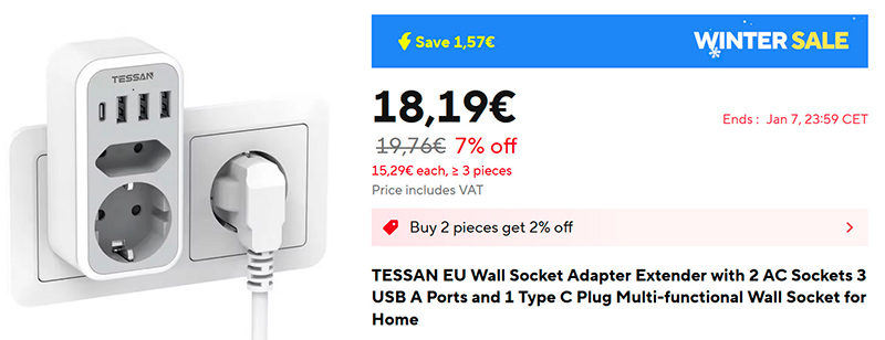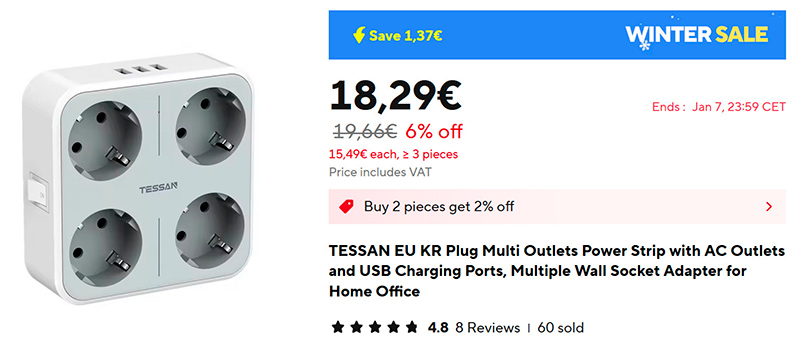 Ну а если нужен прям тройник с USB-портами - у этого же производителя есть вот такой удобный вариант (ссылка для РФ). Он, правда, тоже не тройник, а четверник, но подобный тройник занимает места не меньше, а розеток у него три, а не четыре.