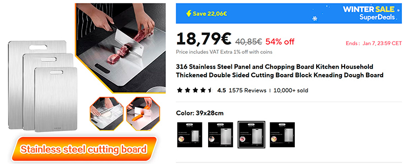 На кухне пора менять разделочные доски. Деревянные я почти не использую (только для сервировки), а пластиковые - не слишком долговечные и быстро теряют вид, там могут накапливаться бактерии. К тому же их мыть не слишком удобно, когда они покрываются надрезами. Поискал стальные разделочные доски - нашел вот такой вариант разных размеров (ссылка для РФ) из стали 316 AISI (с добавкой молибдена). Они легко моются, устойчивы к бактериям и плесени. Затупить ножи я не боюсь, я все равно их периодически подтачиваю.