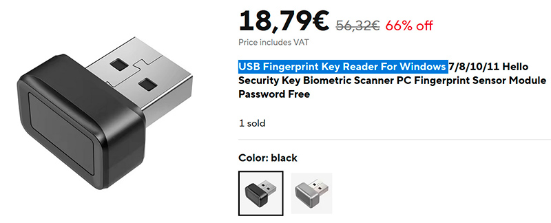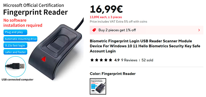 Впрочем, если рядом нет удобного USB-хаба, а биометрию в ПК иметь хочется, то можно приобрести вот такой сканер отпечатка (ссылка для РФ), который подключается к USB по проводу, и его можно расположить в любом удобном месте на столе.