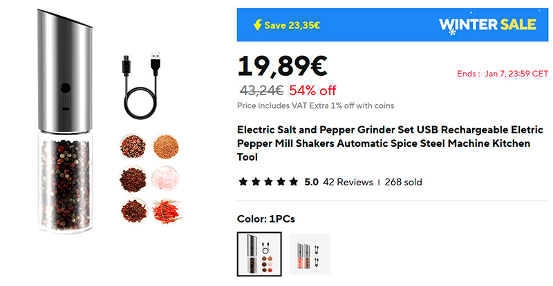 Новый тип гравитационных электромельничек (ссылка для РФ). Гравитационные - это такие, которые срабатывают при переворачивании, то есть они не требуют специальных подставок, куда будет падать соль или перец, и под этими мельничками всегда чисто. И что самое главное - они теперь заряжаются через USB, а то я у своих старых задолбался батарейки менять: там уж по 6 батареек AAA в каждой.