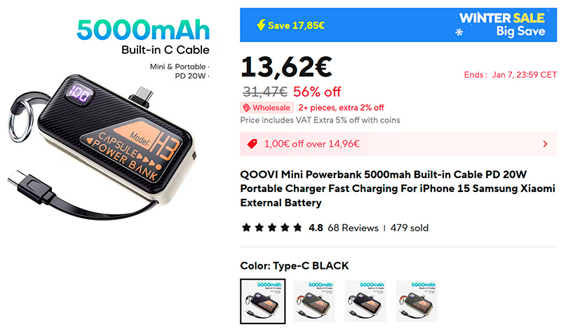 В моей коллекции компактных внешних аккумуляторов - новое пополнение: маленький аккумулятор на 5000 мАч (ссылка для РФ). Может напрямую вставляться в порт, имеет встроенный кабель, также есть дисплей с уровнем заряда и петелька с кольцом для крепления, например, к ключам.