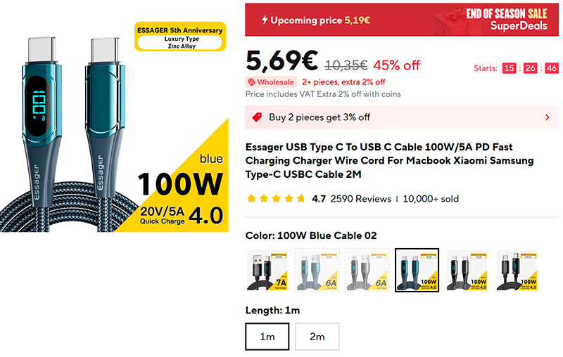 Решил заказать еще пару кабелей с поддержкой мощности до 100 Вт: на мой взгляд, наиболее удобные - это такие кабели, которые сами показывают мощность при зарядке. Подобные кабели выпускает Essager (ссылка для РФ) - я их уже брал, качество отличное. Разные цвета, длина - 1 или 2 метра.