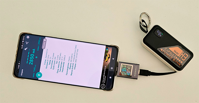 Как оказалось - все в порядке! Заряженный до 100% аккумулятор зарядил разряженный до 0% Xiaomi Mi 11 Ultra, у которого аккумулятор имеет емкость 5000 мАч, до 72%, причем зарядка шла первоначально на мощности 15-18 Вт. Учитывая потери при зарядке (обычно это порядка 25-30%), это означает, что емкость соответствует заявленной. И мощность зарядки - тоже соответствует заявленной: на котроллере смартфона ток был под 3А.