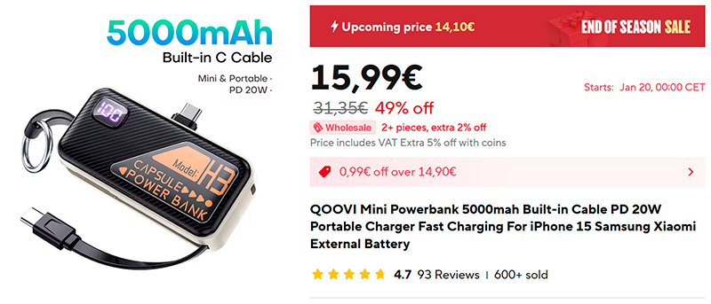 Очередной очень удобный малюсенький внешний аккумулятор QOOVI на 5000 мАч (ссылка для РФ). Type-C для зарядки самого аккумулятора и два встроенных кабеля Type-C для зарядки устройств. Плюс петелька-кольцо, чтобы прикреплять аккумулятор к ключам или к сумке (он реально очень маленький и легкий), цифровой дисплей, показывающий уровень заряда.