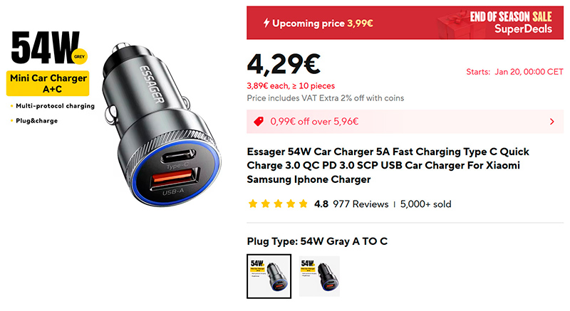 Автомобильный адаптер Essager (ссылка для РФ) поддерживает мощность 54 Вт и протоколы QC 3.0 и PD 3.0, имеет порты USB-A и Type-C. Одновременно может заряжать два устройства. Производитель проверенный, у меня несколько их адаптеров - качество действительно хорошее.