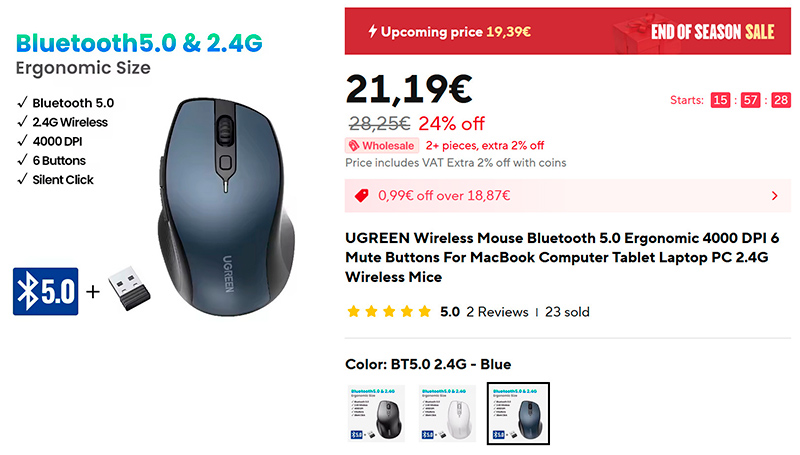 Дешевая эргономичная компактная мышка Ugreen (ссылка для РФ). 6000 DPI (регулируется), 6 тихих клавиш, подключение по Bluetooth (это прежде всего важно для ноутбуков, чтобы порт не занимать) или через адаптер 2.4 Гц, три варианта цветов.