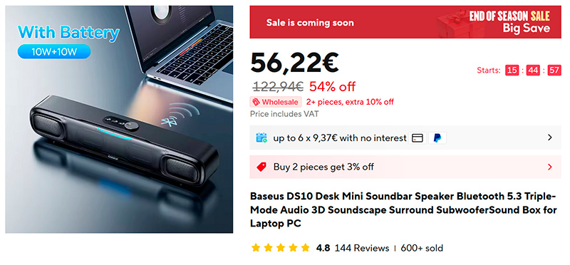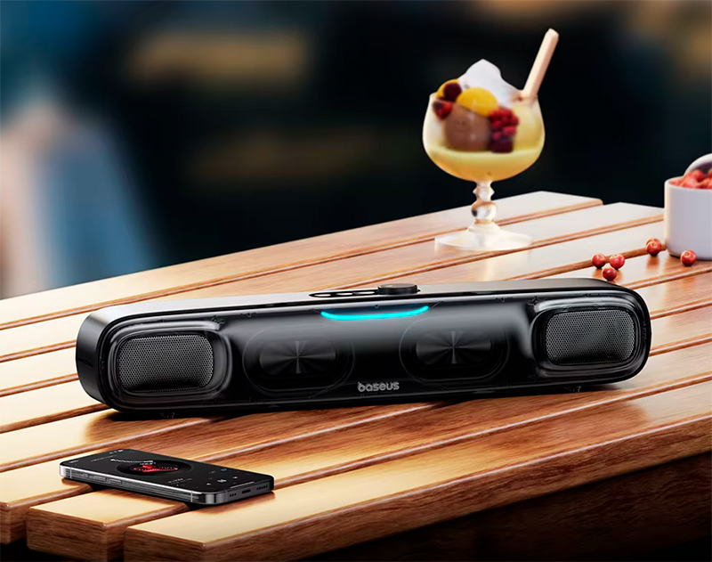 Интересная колонка (минисаундбар) Baseus DS10 (ссылка для РФ). Два двухблочных динамика, два низкочастотных динамика, беспроводное и кабельное соединение, разнообразная динамическая RGB-подсветка, удобная ручка регулировки громкости, поддержка 3D-звучания. Для различных применений - с ПК, ноутбуком, в гостиной, на природе. У моей беспроводной колонки аккумулятор почти сдох, заказал эту - попробую в работе.