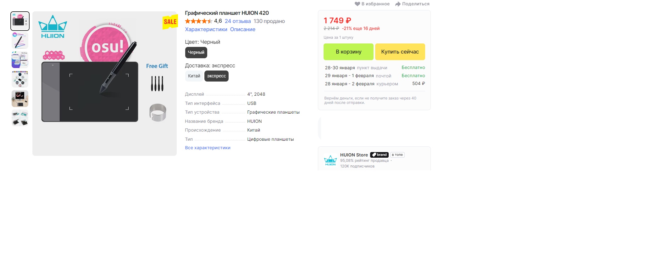 Отличная цена на графический планшет Huion 420 - 1749₽ на AliExpress с экспресс доставкой. Он имеет размер 112×177×7,5 мм с рабочей областью 4"x2,23", разрешение 4000 LPI, скорость отчёта 200 об/с и уровень давления пера: 2048. В комплекте поставляется стилус и 4 сменных наконечника.