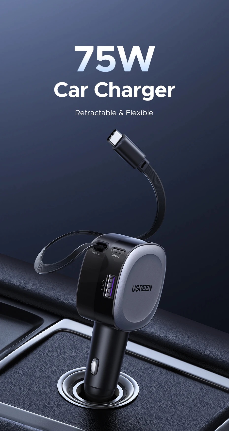Автозарядка UGREEN 75 ВТ с регулируемым по длине кабелем type C (макс 75 см)