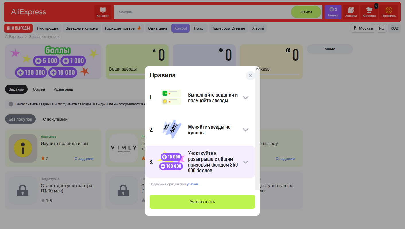 Появилась акция «Звездные купоны». Выполняйте задания, получайте звезды и обменивайте на купоны. Первые задания уже доступны.
