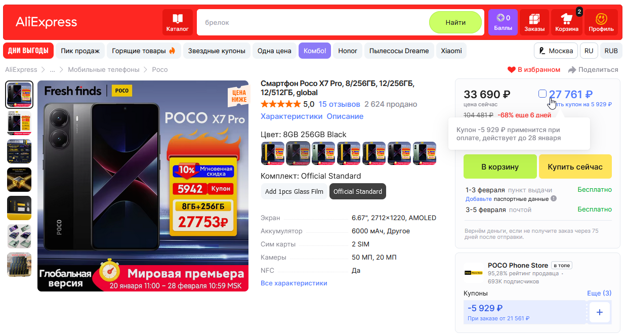 Цена версии 8/256Gb с купоном 28061р. 33990р. (в оф.POCO магазине)