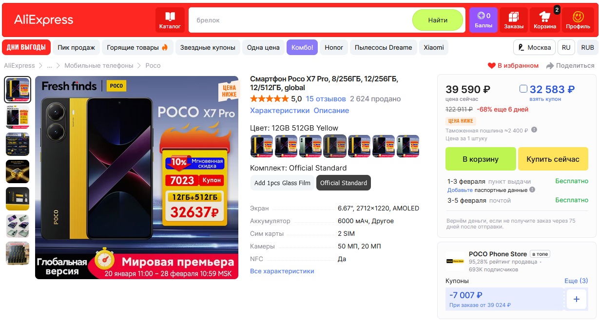 Цена версии 12/512Gb с купоном 32583р. 39590р. (в оф.POCO магазине)
