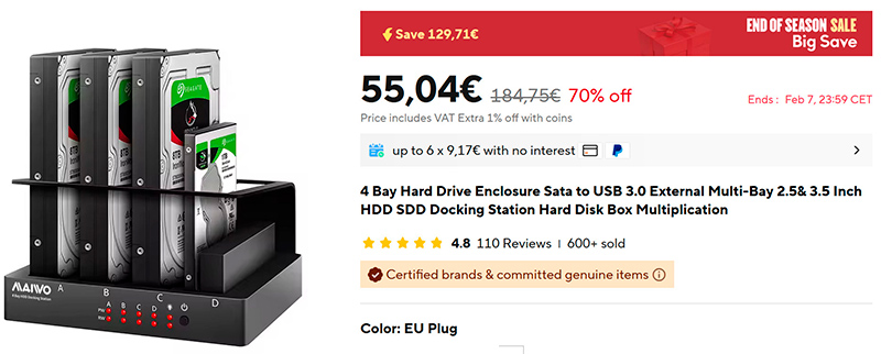 Несколько дней назад выпустил статью про всякие DAS - накопители, подключаемые напрямую к ПК или NAS. И вот попалась совсем недорогая моделька на 4 жестких диска (ссылка для РФ). Для тех, кто для бэкапов использует более двух дисков, модель может показаться интересной. Хотя лично я предпочитаю закрытые модели. Но они минимум раза в три дороже.