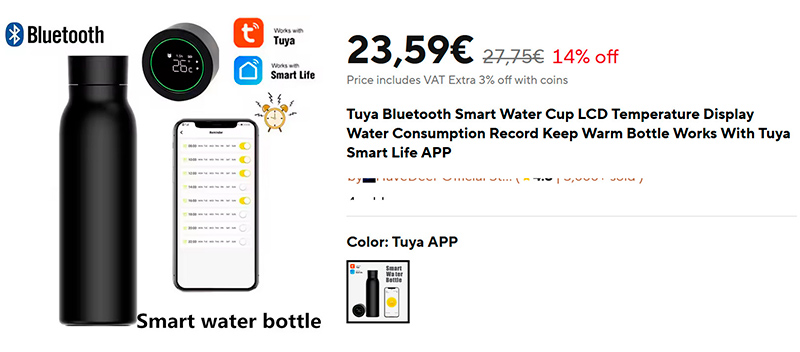 Продвинутый стальной термос для настоящих гиков (ссылка для РФ): 600 мл, дисплей, показывающий температуру, также есть возможность увидеть температуру жидкости в термосе на смартфоне в приложении. 12 часов держится теплый напиток, 24 часа держится охлажденный напиток. Одного заряда хватает на 30 дней работы.