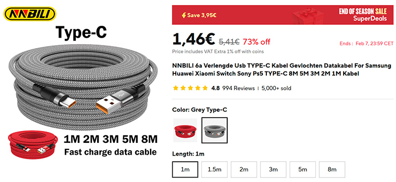 Обычно USB-кабели предлагаются в трех-четырех размерах - от 0,5 м до 2 м. А что если нужен более длинный кабель - 3 или даже 5 метров? Так вот, их есть на Aliexpress! Качественный кабель (ссылка для РФ), поддерживающий быструю зарядку, причем размеры от 1 метра до аж 8 метров. Более 5000 продаж, под 1000 отзывов со средней оценкой 4,8. Мне как раз недавно нужен был кабель длиной 3 метра, который мог бы заряжать ноутбук (этот кабель поддерживает до 6А, а значит, годится) - заказываю.