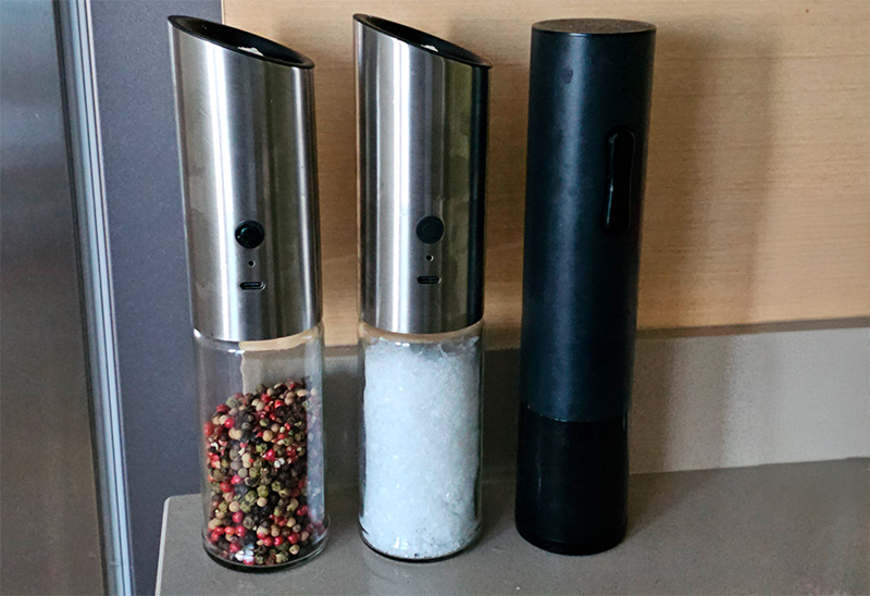 Рубрика "По следам наших выступлений". Приехали вот эти электрические мельнички (ссылка для РФ). Они стоят на столе соплом вверх, то есть из них на поверхность ничего не сыплется, а чтобы мельничка начала работать, ее нужно перевернуть. Я когда первый раз столкнулся с мельничками такого типа, другие уже не покупаю. У данных конкретных моделей главный плюс - встроенный аккумулятор, который заряжается через порт USB (предыдущие мельнички были аж на шести батарейках, которые приходилось часто менять). Также если просто перевернуть мельничку - соль/перец не посыпятся, надо предварительно нажать кнопку. И это, в общем, правильно - и лишняя защита от ложных срабатываний, и аккумулятор быстро не расходуется. Плюс когда ты нажимаешь на кнопку, она включает мельничку, и та потом выключится только через несколько минут неактивности, то есть если тебе надо посыпать специями, например, продукты на большом подносе, то кнопку нажать нужно будет только один раз.