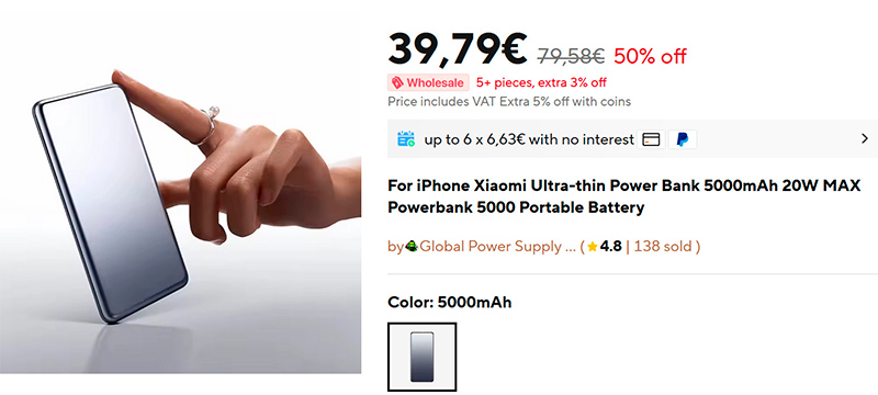 Недорогой ультратонкий внешний аккумулятор Xiaomi (ссылка для РФ) на 5000 мАч с поддержкой быстрой зарядки до 20 Вт.