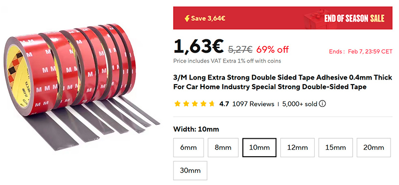 Еще из проверенного - вот этот двухсторонний скотч (ссылка для РФ) меня уже много раз выручал. Удобно, что можно взять скотч разной ширины, и вот особенно 30-миллиметровый у меня дома используется очень часто, особенно когда что-то нужно или повесить на вертикальную поверхность или закрепить. Длина рулона - 3 метра.