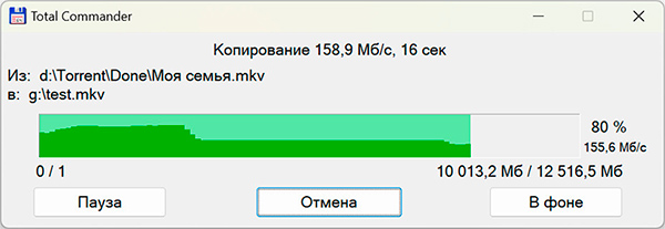 Кстати, реально быстрая: у меня такая же их флешка, только без защиты по отпечатку. Вот, например, копирование на нее файла в 12 ГБ - скопировалось менее чем за минуту, средняя скорость - 160 мегабайт в секунду.