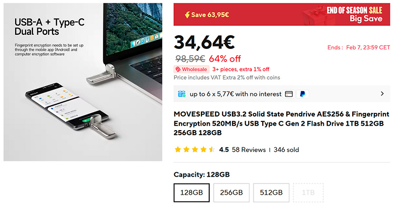 Универсальная флешка от Movispeed (ссылка для РФ) с портами USB-A и USB-C и с защитой данных по отпечатку пальца.
