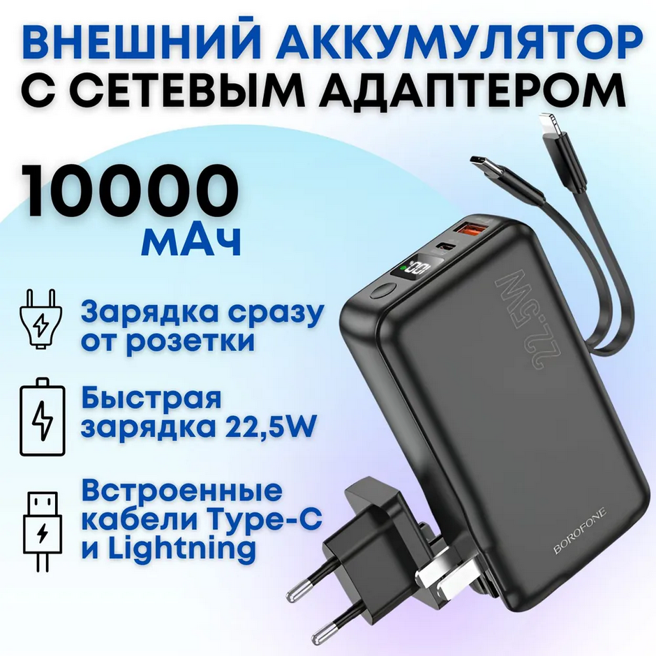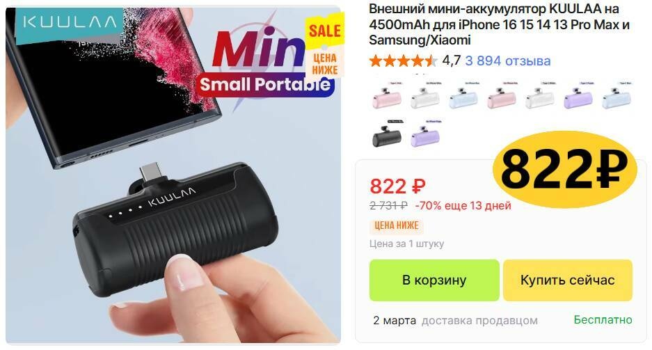 Ёмкость 4500 мАч, поддержка быстрой зарядки, индикация остатка заряда, на выбор со штекерами Type-C или Lightning. В карточке товара есть различные цвета.