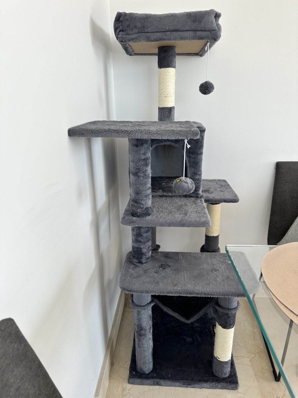 Я засматривался на такие вертикальные домики в офлайн магазинах, так там для сравнения цена самого дорого в Merca China - 100 евро, в Tiendanimal свыше 200 евро, при этом визуально у них качество было ну такое себе. Когда же пришло это дерево, когда я его собирал, поразился очень высокому качеству исполнения, удобству сборки, ничего нигде не перекашивается, всё очень четко, все детали были отмечены и инструкция очень понятная. Материал тактильно очень приятный. Моя кошка оценила, сидит там с удовольствием, иногда затаскивает туда своих игрушечных мышей и там с ними играет.