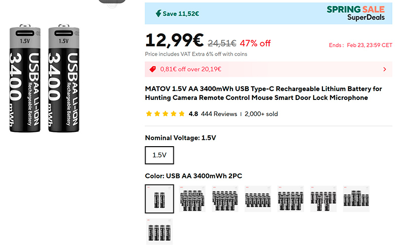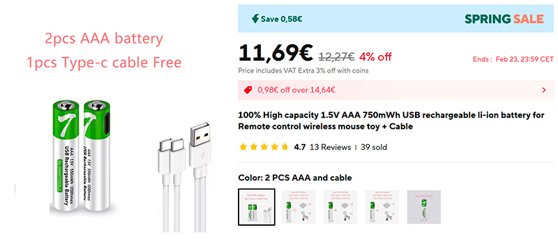 Поэтому оптимальный вариант - аккумуляторы, которые заряжаются через USB-порт. Тут тебе и экономия, и удобство. Вот, например - перезаряжаемые литий-ионные аккумуляторы AAA на 750 мВч (ссылка для РФ), заряжаемые через Type-C. Комплекты по 2,4, 8 или 12 аккумуляторов. В комплекте идут двойные кабели для зарядки.