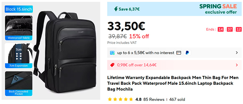 Качественный рюкзак из водонепроницаемой ткани "Оксфорд" Tigernu T-B9121 (ссылка для РФ). Рюкзак может раздвигаться на 7 см, увеличивая свою емкость. На молнию дается пожизненная гарантия. Несколько отсеков, независимый отсек для ноутбука. Две версии - для ноутбука до 15,6" и для ноутбука до 17".
