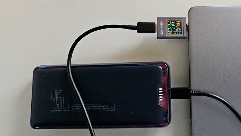 Я его полностью зарядил и подключил заряжать мой ноутбук Xiaomi RedmiBook 16 Pro 2024, у которого емкая батарея на 99 Вт·ч. Мой предыдущий ноутбук, у которого 60 Вт·ч, аккумулятор на 20000 мАч заряжал где-то до 90%, так что я рассчитывал, что в данном случае, если заявленная емкость у аккумулятора реальная, получится где-нибудь 60%.