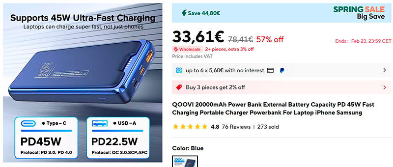 Искал аккумулятор для зарядки ноутбука на 20000 мАч с поддержкой PD не менее 45 Вт, и чтобы при этом не стоил как самолет (у Ugreen мощные аккумуляторы на 20000 мАч - порядка €100). Нашел вот такой недорогой вариант - аккумулятор QOOVI 20000mAh PD 45W (ссылка для РФ).