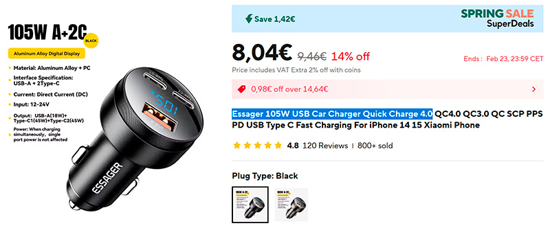 Нужно иметь возможность быстро зарядить в машине 2-3 смартфона - вот хороший автомобильный адаптер Essager (ссылка для РФ) на три порта (два Type-C и один USB-A), поддерживающий почти все протоколы быстрой зарядки, суммарной мощностью в 105 Вт. Два порта Type-C до 45 Вт и порт USB-A до 18 Вт. Также есть дисплей, показывающий текущую мощность зарядки.