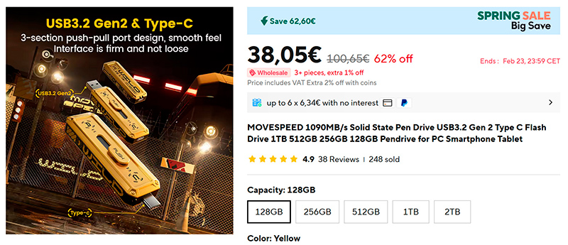 Очень быстрые и емкие универсальные внешние SSD Movespeed (ссылка для РФ) для всевозможных применений с ПК/ноутбуком, планшетом и смартфоном - там есть коннектор USB-A и коннектор Type-C. Скорости - до 1090 МБ/с, емкости - 128GB, 256GB, 512GB, 1TB и 2TB.