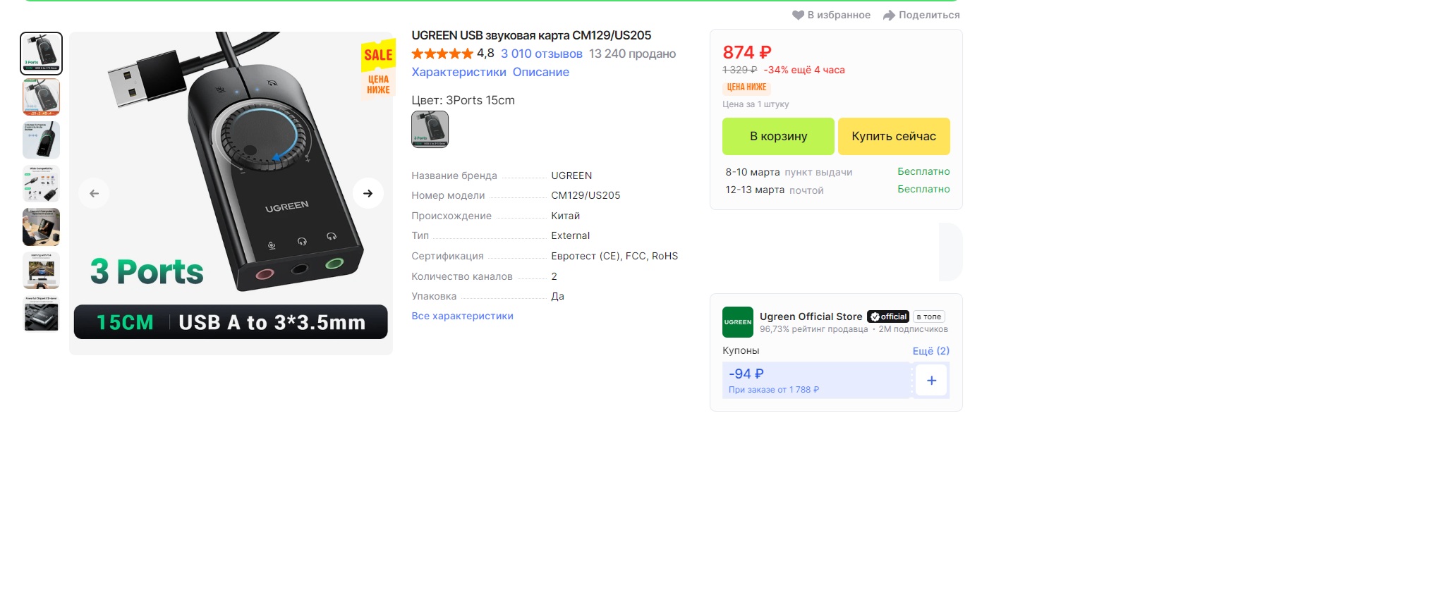 Звуковая карта UGREEN за 874₽ на AliExpress