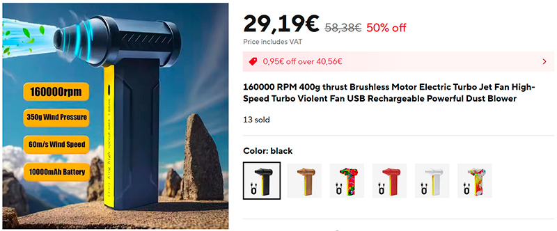 Мощная воздуходувка (ссылка для РФ) на 160000 оборотов, работающая на бесщеточном моторе. Для самого разнообразного применения. Я такой штукой продуваю клавиатуру и компьютер и его комплектующие от пыли. Обычным пылесосом эту пыль вытащить невозможно, а такая штука все выдувает наружу, где пыль уже можно собрать щеткой или обычным пылесосом.