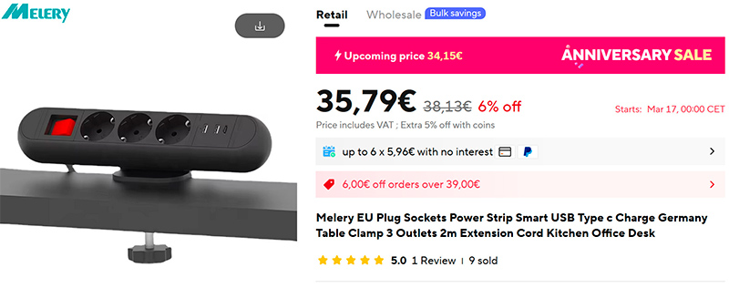 Интересный вариант удлинителя (ссылка для РФ), который крепится к поверхности на струбцине. Три европейских розетки, два порта USB-A, порт Type-C, выключатель.