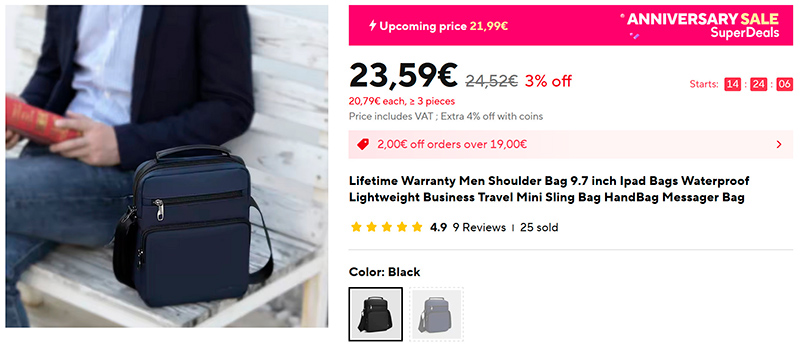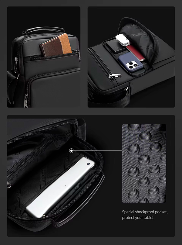 Мужская сумка через плечо Tigernu T-L5200 (ссылка для РФ). Сделана из водонепроницаемого и износостойкого материала, имеет надёжную фурнитуру, несколько отсеков, размер 20.5х27х7, объём 3.3 л, вес сумки 480 г. Несколько отсеков, в том числе закрывающихся на молнию, ударопрочный отсек для планшета размером 9,7".
