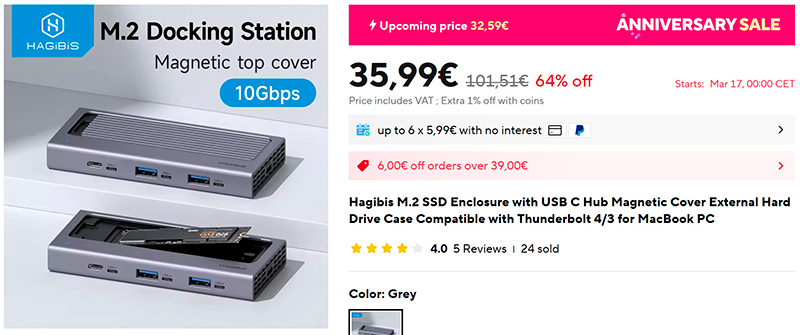 >> В компании Hagibis додумались объединить USB-хаб с кейсом для SSD M.2 (ссылка для РФ). Два порта USB-A, порт Type-C. Поддерживаются M.2 четырех размеров: 2230, 2242, 2260 и 2280. Крышка над SSD - магнитная, накопители можно при необходимости менять. А что - удобно: и для ноутбука, и для ПК. Тут тебе и накопитель, и хаб.