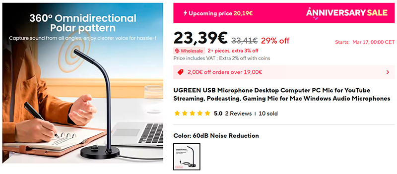 Удобный, компактный и недорогой всенаправленный выносной микрофон UGREEN (ссылка для РФ). Для голосового общения, видеоконференций. стриминга и так далее. Встроенные микрофоны веб-камер дают плохое качество, и я давно перешел на отдельный микрофон такого типа. Подключается по USB, имеет регулировку громкости и отключения звука.