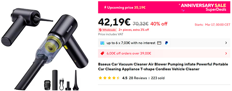 Многофункциональный пылесос он же воздуходуйка Baseus (ссылка для РФ). Приличная мощность всасывания - 5000 Па, - моющийся HEPA-фильтр, зарядка через USB, несколько насадок для самых разных применений.