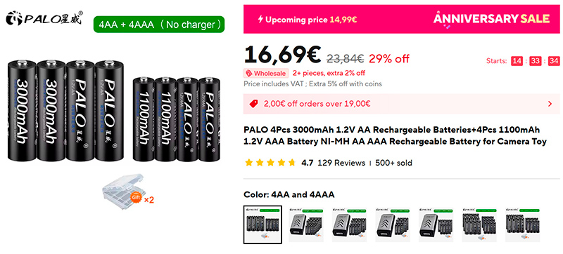 Никель-металл-гидридные перезаряжаемые аккумуляторные батарейки (ссылка для РФ) AA на 3000 мАч и AAA на 1100 мАч известного производителя. Есть разные варианты комплектаций, есть комплекты с зарядным устройством.