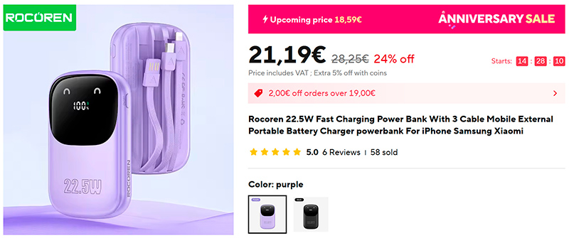 Недорогой внешний аккумулятор на 10000 мАч (ссылка для РФ) мощностью 22,5 Вт, дисплеем, показывающим уровень заряда, и тремя встроенными кабелями USB-A, Type-C и Ligtning.