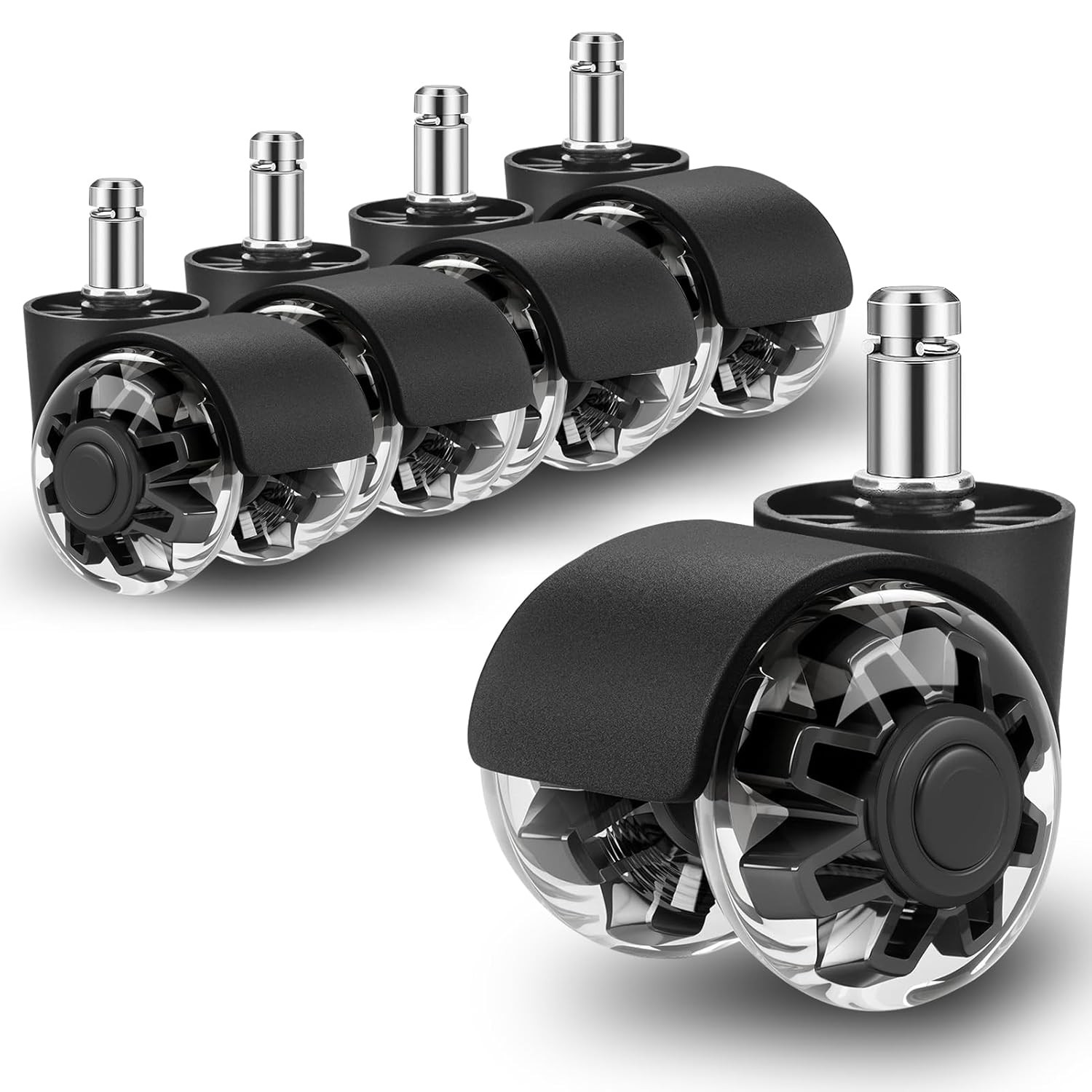 Не думал, что пригодятся комментарии про замену колес. Спасибо всем, кто рассказывал про разницу между обычными и ИКЕЕвскими (10 или 11 мм). Взял вот эти, теперь кресло катится мягко, без похрустывания. Где-то в обзоре прочитал, что выдерживают 485 кг каждое, так что мои 95 для них ерунда. Если кто-то думает, стоит ли менять колеса — однозначно да, иначе придется держать спинку кресла поднятой 😊
